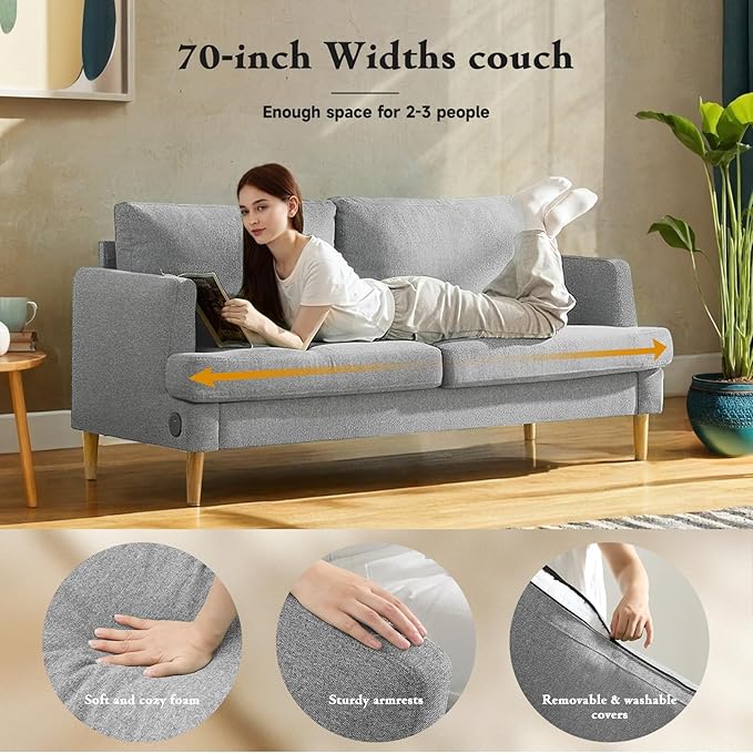 Loveseat Sofa Couch for Living Room with USB Type C Ports – Light Gray Upholstered 70" Small Couches for Bedroom, Office or Apartment–Modern 2-Seater Deep Seating with Soft Cushions & Sturdy Frame