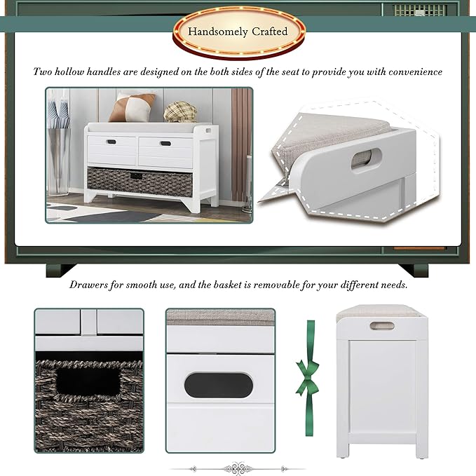 Fully Assembled Storage Bench with Cushioned Seat, 2 Drawers & Removable Basket, Solid Wood Entryway Shoe Bench for Bedroom, Hallway, Living Room (White)