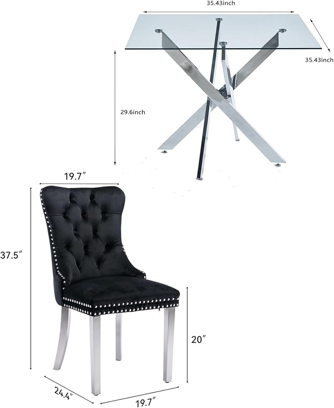 Goujxcy 5 Piece Glass Dining Table Set Modern Small Glass Dining Table Set for 4, 35.43" Square Kitchen Table and 4 Velvet Upholstered Chairs for Kitchen Dining Room, Silver & Black