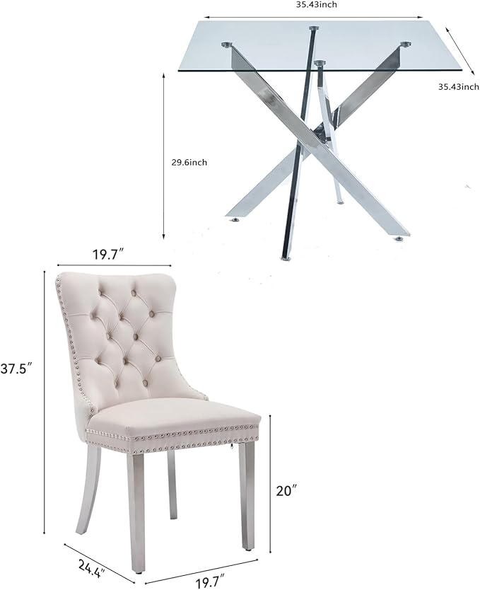 Goujxcy 5 Piece Glass Dining Table Set Modern Small Glass Dining Table Set for 4, 35.43" Square Kitchen Table and 4 Velvet Upholstered Chairs for Kitchen Dining Room, Silver & Beige
