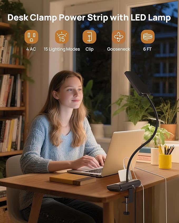 TROND LED Desk Lamp with Clamp Power Strip - Eye Caring Desk Light with 4 Surge Protector Outlet, 15 Lighting Mode, 6ft Flat Plug Extension Cord, Gooseneck for Home Office College Dorm Room Essentials
