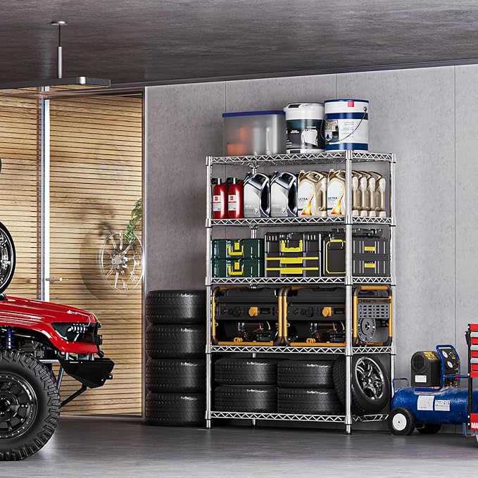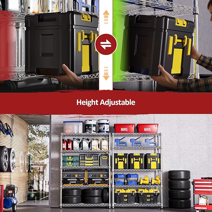 - 【Adjustable Shelves – Flexible for All Needs】Customize your storage your way. Each shelf can be easily adjusted in 1-inch increments to fit items of varying sizes—from bulky tools to compact kitchenware. This wire shelving unit adapts to your unique storage needs, creating a more organized and efficient space.