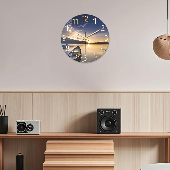 - 1.[Size] - The sunset wall clock is 16 inches x 16 inches,HD glass wall clock,frameless analog wall clock,round wall clock for bedroom,decorative wall clocks for living room,coastal wall clock for bathroom,quiet wall clock for office,beach wall clock for kitchen.