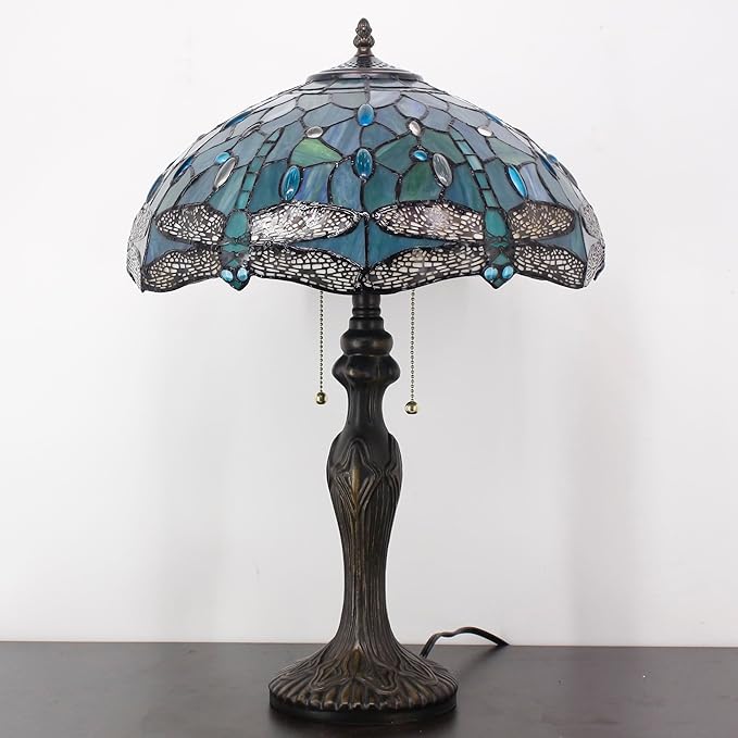 Tiffany Table Lamp Sea Blue Stained Glass Dragonfly Style 16X16X24 Inch Antique Reading Light