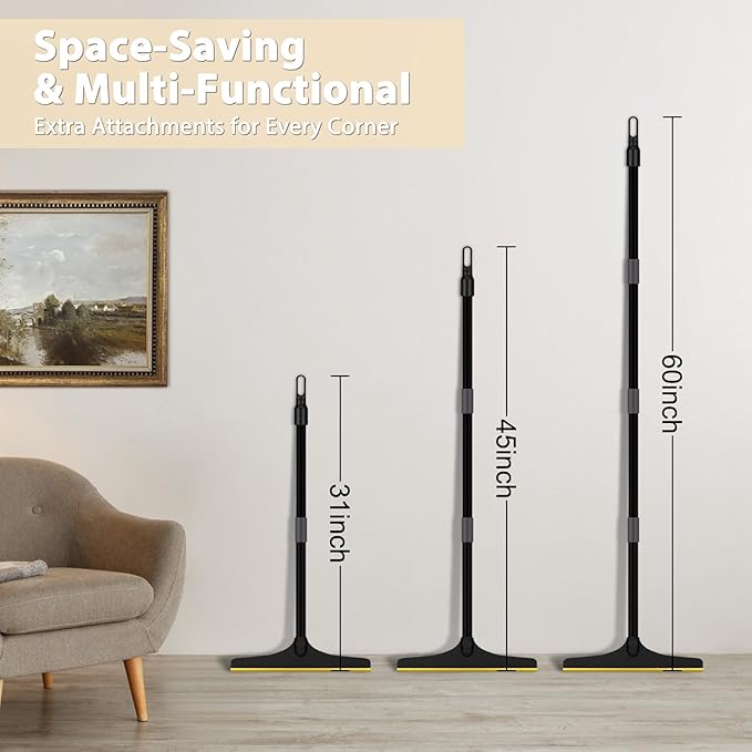 - Much Longer Handle Reaches Deep & Remove it All: The handle of the dog hair remover, composed of a session of 4 pieces of high-quality steel sections, is adjustable in length ranging from 31 to 60 inches. With its 60” extra long handle , the pet cat dog hair broom for carpet reaches even the most embedded fur & lint in a single swipe.