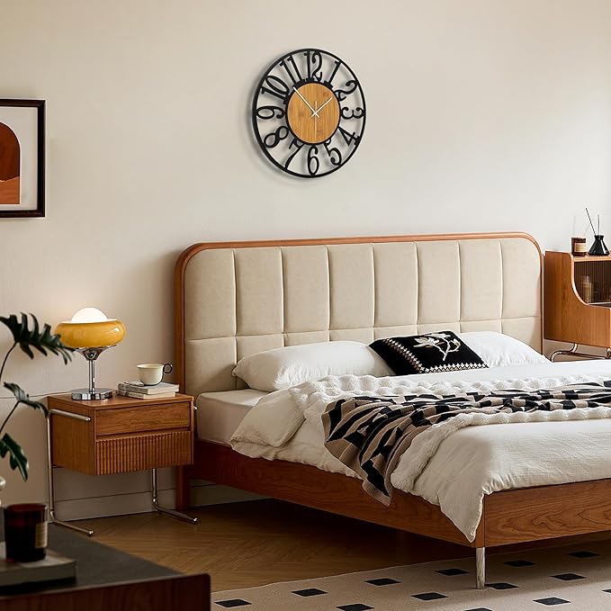 - 【Long-lasting Quality Clock】The black metal clock has a hollowed-out retro design. The strength and retro appearance of the Arabic Number wall clock are ensured by the use of high-quality materials in the handcrafted, solid iron frame and showing the wooden face.
