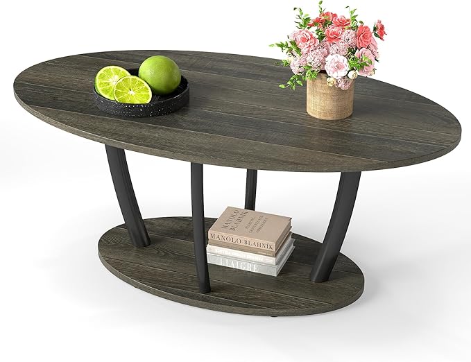 Manora Rustic Small Oval Coffee Table for Living Room, Narrow Wood Center Table with Shelf, Retro Style Coffee Table with Curved Metal Legs, Stable and Easy Assembly, Gray