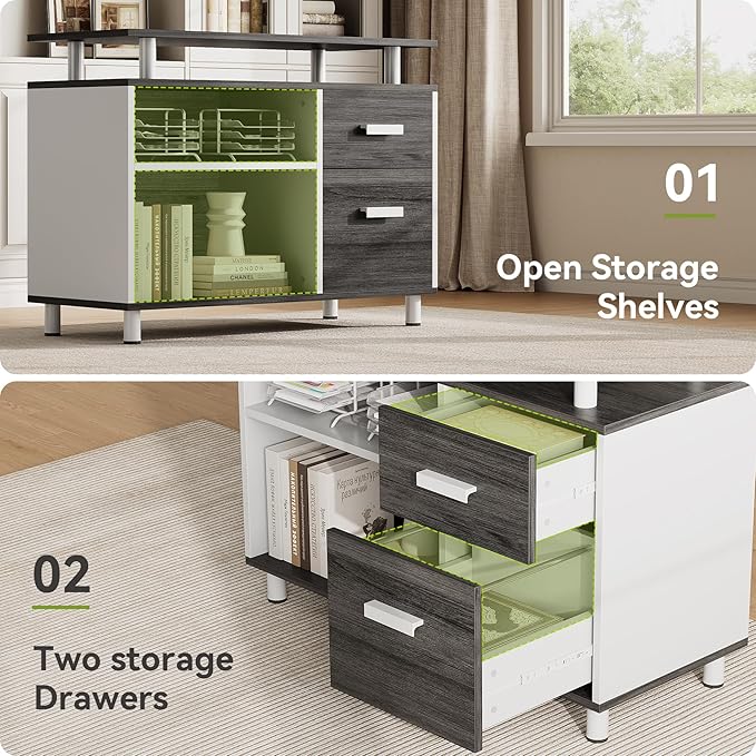 LITTLE TREE Large Computer Desk with File Cabinet, 63-Inch Executive Desk L Shaped Office Desk with Drawers and Storage Shelves, Business Furniture Desk Workstation for Home Office (Grey + White)