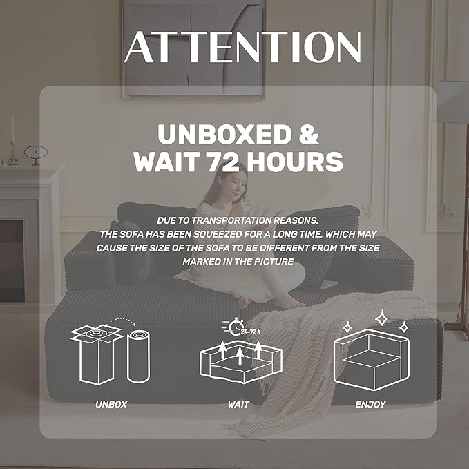 - Important Note:After unboxing, allow 24 - 72 hours for the folding sofa to fully expand and regain its natural shape. This ensures maximum softness and comfort. For the best results, let it rest before use. Additionally, lightly patting the sofa can expedite the expansion process for a quicker setup