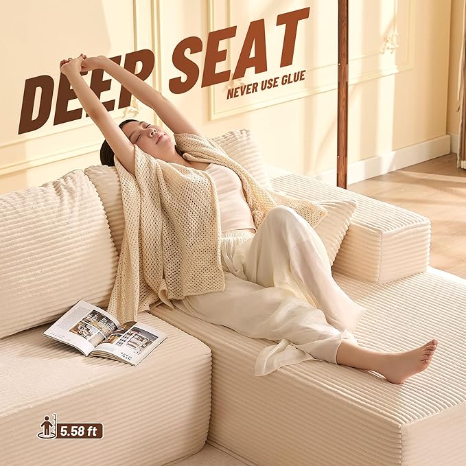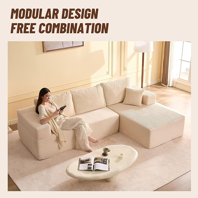107" Boneless Couch with Deep Seat, Modular Sectional Sofa, Cloud Sectional Couch for Living Room, No Assembly Required, Corduroy, L-Shape Right?White