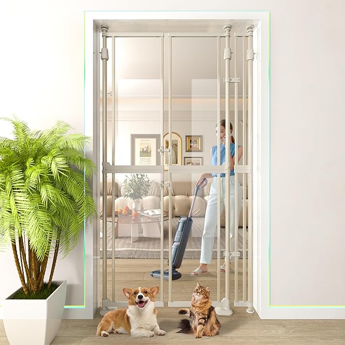 74" High Extra Tall Cat Gate,33.85-42" Wide Opening.Auto Closing and No Drilling Pressure Mount Design,Tall Dog Gates for Doorway, Stairs, House, Innovation Double Opening Pet Gate,Transparent,White