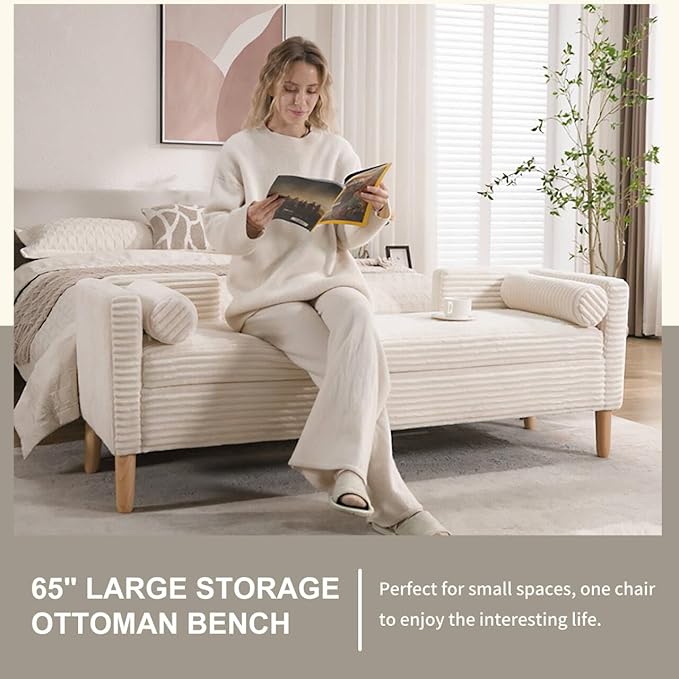 NIOIIKIT 65" Large Storage Ottoman Bench with 2 Pillows, Corduroy Upholstered Entryway Bench with Wood Leg, End of Bed Bench with Straight Armrest, Window Bench for Bedroom, Entryway (White)