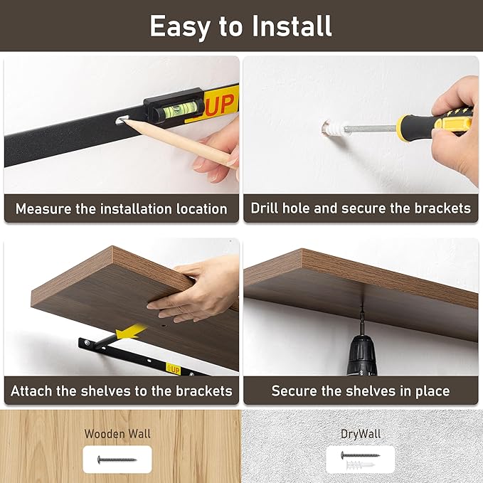 - Effortless Installation: Mounting these floating shelves is a quick and easy process. Each set includes stainless-steel brackets, a magnetic level, drywall anchors, and screws, ensuring a secure and hassle-free installation. A fixing screw on the bottom of the shelf prevents any shifting, making it sturdy and reliable for long-term use.