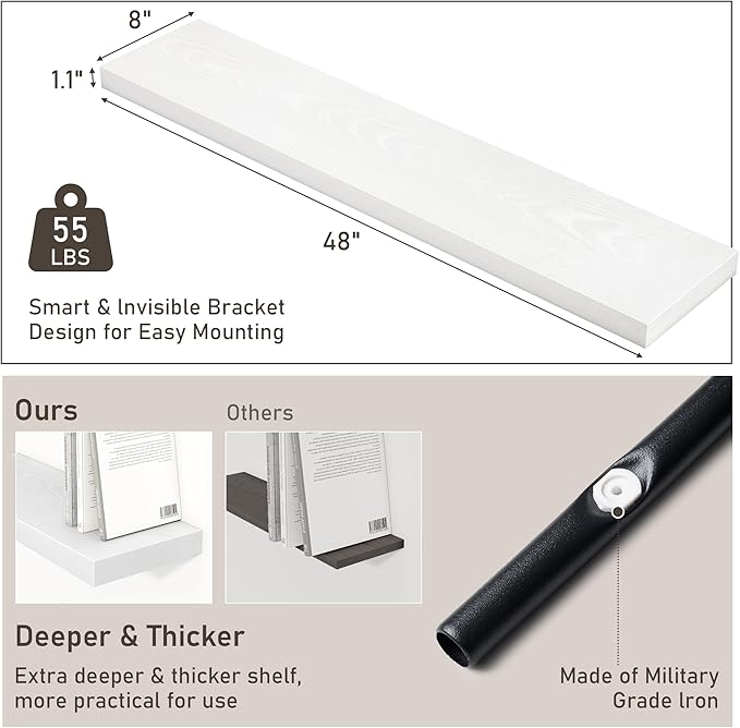 Fun Memories 48 Inch Floating Shelves for Wall 8 Inch Deep White Shelves Set of 2, Wall Mounted Rustic Wood Long Floating Shelf, Large Display & Storage Shelf with Invisible Brackets