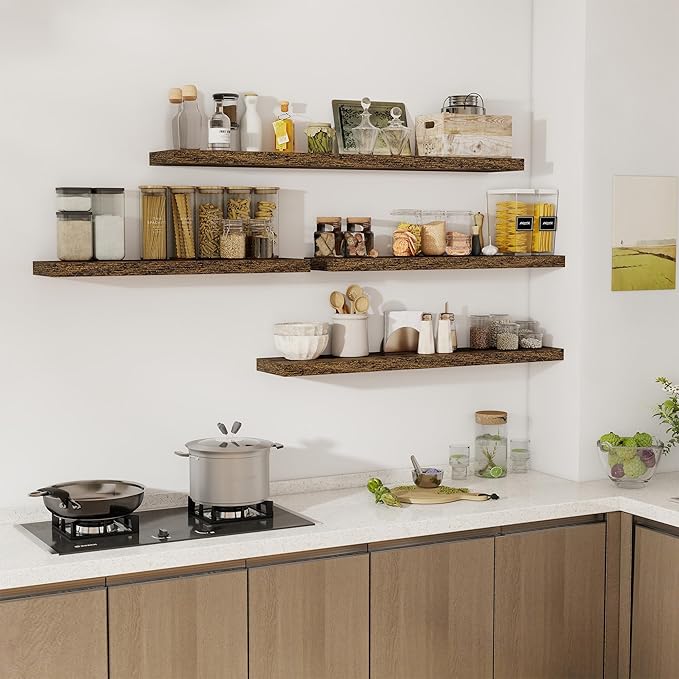 - Stylish Floating Shelves with Rustic Charm: Constructed from premium engineered wood and finished with a realistic wood grain veneer, these floating shelves bring a natural, rustic touch to your space. The textured wooden surface creates a cozy and warm atmosphere, making them a perfect addition to both contemporary and traditional interior designs. These sturdy shelves offer both beauty and practicality for your home.