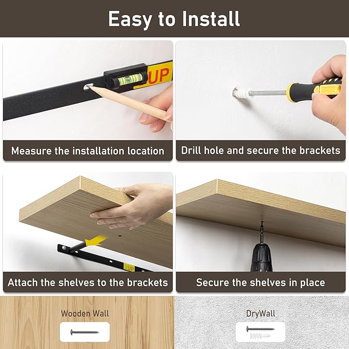 - Effortless Installation: Mounting these floating shelves is a quick and easy process. Each set includes stainless-steel brackets, a magnetic level, drywall anchors, and screws, ensuring a secure and hassle-free installation. A fixing screw on the bottom of the shelf prevents any shifting, making it sturdy and reliable for long-term use.