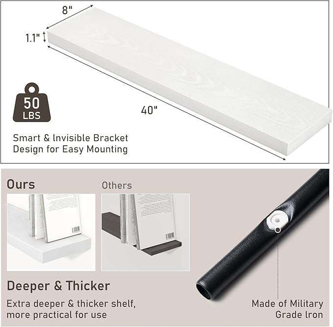 Fun Memories 40" Floating Shelves for Wall, 8 Inch Deep Floating Shelf for Books, Deep Bathroom Shelves Wall Mounted, Rustic Display Shelf for Kitchen, Bedroom, Living Room, White Color, 2 Pack