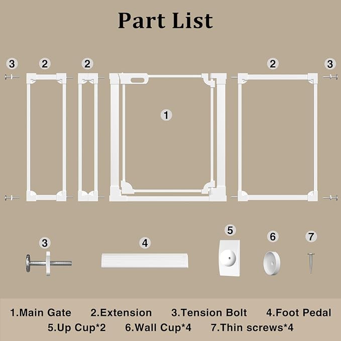 - Two Installation Methods: Method ①: pressure mounting, which comes with 4 adjustable pressure bolts and 4 Up Cup, is very easy and quick to install with no tools, no drilling and no damage to the walls of the house;Metho ②: drilled mounting. If you are using acrylic gate at the top of the stairs, use our drilled mounting. It will make the clear gate more solid and won't wobble