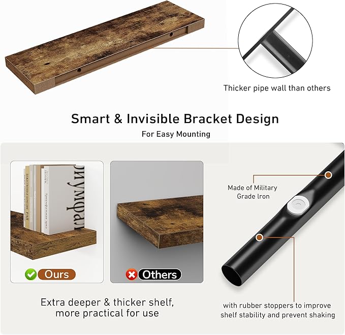 Fun Memories 36 Inch Floating Shelves - Rustic Wooden Wall Shelves - Wall Mounted Storage Shelf with Invisible Brackets - Extra Deeper & Thicker for Living Room, 36" W x 9.3" D x 1.5" H - Rustic Brown