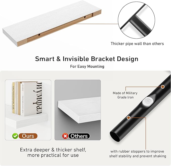 Fun Memories 36 Inch Floating Shelves - Rustic Wooden Wall Shelves - Wall Mounted Storage Shelf with Invisible Brackets - Extra Deeper & Thicker for Living Room, 36" W x 9.3" D x 1.5" H - White