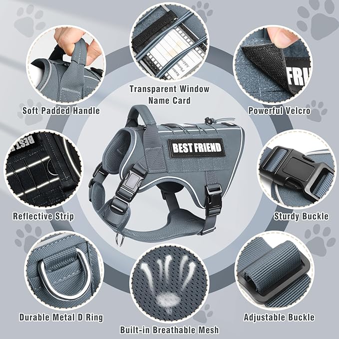 Tactical Dog Harness Small Sized Dog,No Pull Military Dog Vest with Handle,Reflective Heavy Duty Pet Harness for Walking Hiking Training Gray S