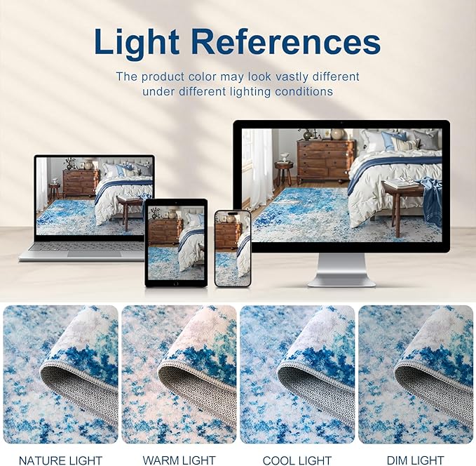 - Neutral Abstract Rug: This rug features a unique neutral abstract design that combines color the blue and white, adding more warmth and cozy to your home. The carpet is good for living room, bedroom, dining room, nuesery room, study room, etc