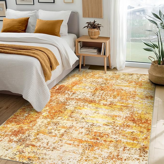 Washable Area Rugs for Living Room - 6x9 Abstract Modern Rug Neutral Soft Rug Stain Resistant Non-Shedding No Slip Low Pile Large Carpet for Bedroom Dining Room Nursery Home Office - Orange/Gold