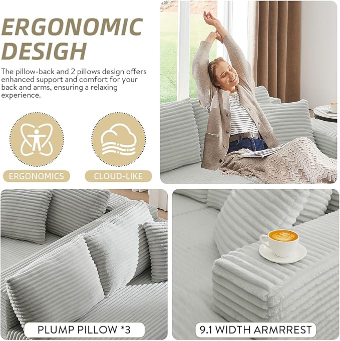 - 【Soft Corduroy Fabric】This oversized comfort cloud sofa is made of high-quality corduroy fabric, blending delicacy and practicality together.The textured surface resists stains and scratches, while breathable channels ensure year-round comfort.