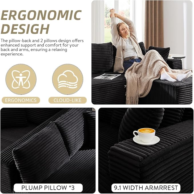 - 【Soft Corduroy Fabric】This oversized comfort cloud sofa is made of high-quality corduroy fabric, blending delicacy and practicality together.The textured surface resists stains and scratches, while breathable channels ensure year-round comfort.
