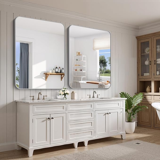 FORBATH 36x48 Inch Silver Bathroom Mirror for Over Sink, Large Rectangular Wall Mirror with Metal Frame, Rounded Corners for Bathroom, Bedroom, Entryway Decor (Horizontal or Vertical)