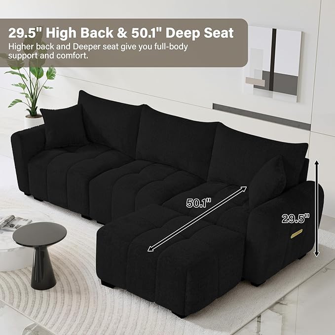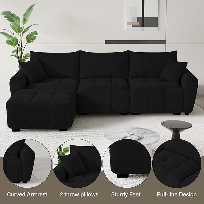 110" L Shaped Modern Boucle Sofa Modular Sectional Cloud Couch with Ottoman, Tufted 4-Seat Deep Seat Sofa with Pillows for Living Room, Bedroom and Apartment, Black