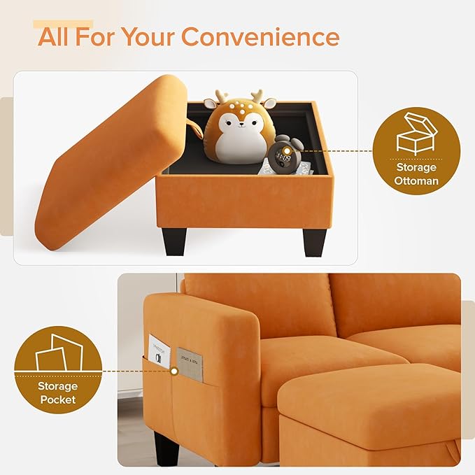 Sectional Sofa Couches for Living Room - 78''Convertible Modular Three-Seater L-Shaped Pet-Friendly Couch,Washable Sofa Cover-Bench Storage, Suitable for Small Living Room, Apartment,Office-Orange