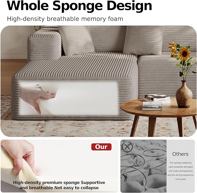 - Plush Corduroy & Detachable Sofa Set: Indulge in the premium feel of our plush corduroy fabric, which offers exceptional softness, warmth, and breathability. This detachable sofa set features a stain-resistant cover that is remarkably easy to remove and machine wash, ensuring your modular sectional sofa stays fresh, hygienic, and looking new for years with minimal effort.
