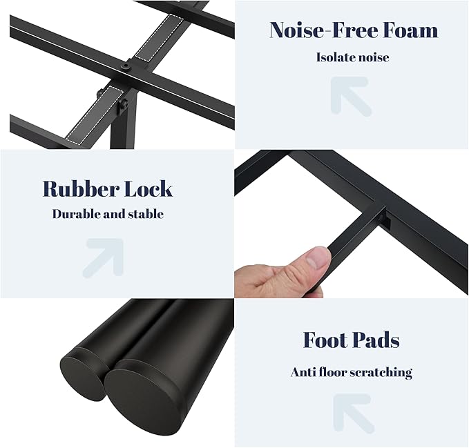 - Metal Material: This bed frame is constructed with a thickened metal framework, providing long-lasting support and ensuring stability with a weight capacity of up to 800 lbs. The metal bars are equipped with noise-reducing pads, guaranteeing a quiet and undisturbed sleep. Our bed frame delivers ultimate comfort and support.