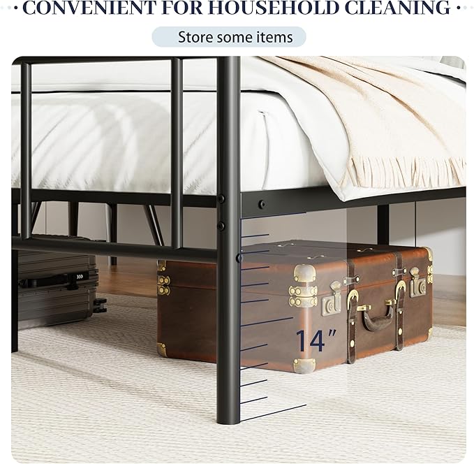 - The bed offers ample under-bed storage space: Our metal bed frame provides 12 inches of storage clearance. This allows you to easily store and access items, as well as effortlessly clean underneath the bed, keeping your bedroom neat and organized. It’s an ideal choice for small apartments, dorm rooms, or minimalist-themed spaces.