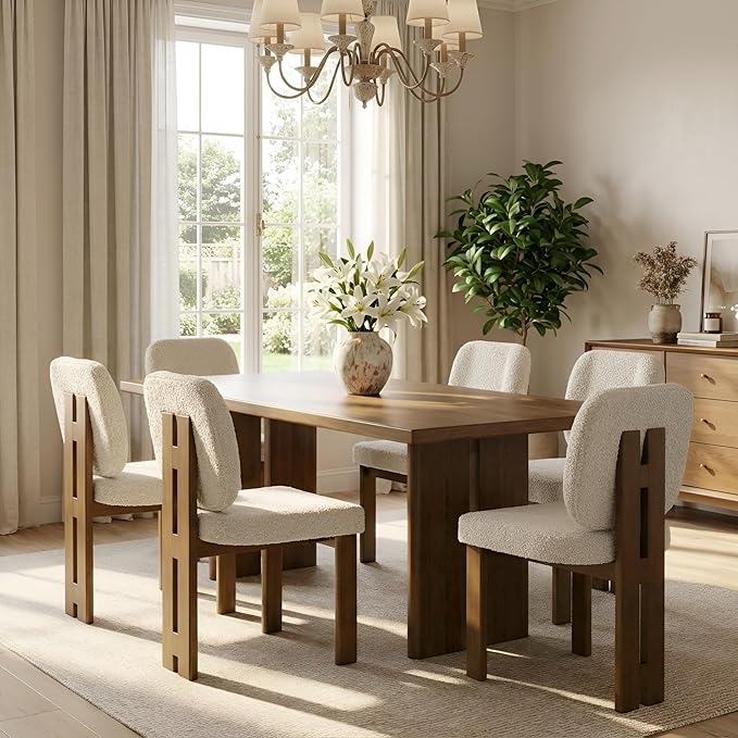 Modern Boucle Dining Chairs Set of 6, Farmhouse Sherpa Upholstered Wooden Kitchen Chairs with Back, Side Armless Dining Room Chairs with Walnut Wood Legs for Kitchen Restaurant, Beige