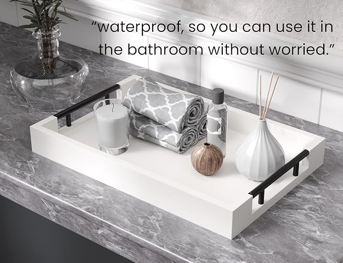 Bamboo Serving Tray with Metal Handles,15x10in Ottoman Decorative Trays Platter for Coffee Table,Living Room,Bar,Party,Mediuml(White)