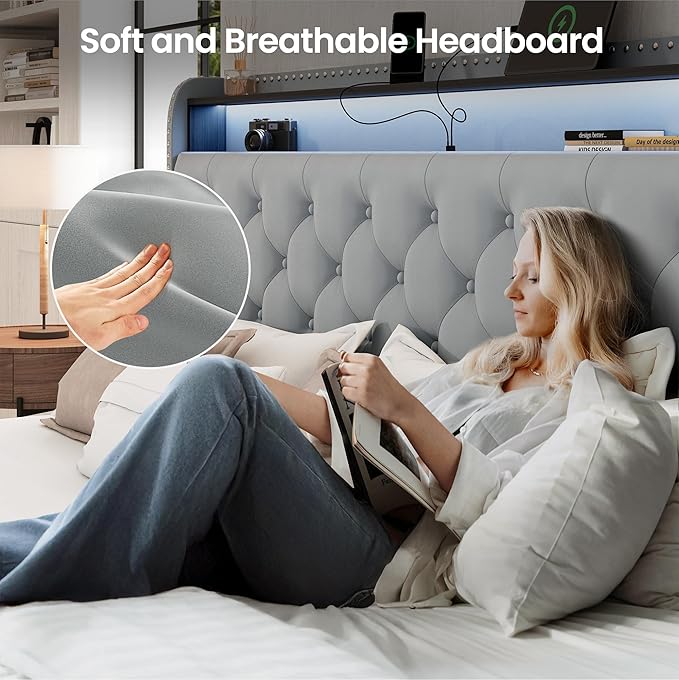 - [Sleek Led lighting]: The tufted bed frame builds LED lights in the headboard. Then it could creat a relaxing and ambient atmosphere in your bedroom