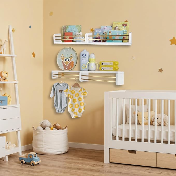 - Stylish & Safe Display – Floating shelves with a front safety bar secure books, toys and décor while elevating nursery or kids’ room organization.