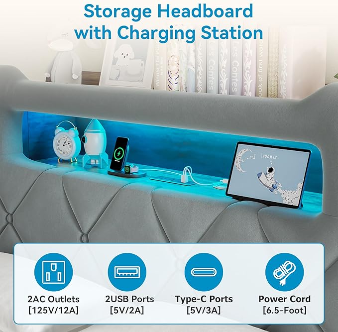 - CHARGING STATION & 2-TIER HEADBOARD STORAGE:This princess bed offers not only comfortable upholstery and an elegant look but also added more convenience. The queen bed frame with charging station features two AC outlets, two USB ports, and one Type-C port right on the headboard, so your devices stay powered up without leaving bed. The 8.5" wide double-layer shelf offers ample bedside storage, like a mini bookcase, while the 11.8" deep side cubby keeps essentials within easy reach