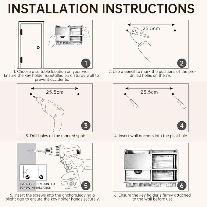 - Easy Installation:Key rack comes with clear instructions manual, necessary hardware and keyhold bracket distance measuring ruler. You can mount it on the wall in minutes, no complex tools or skills required