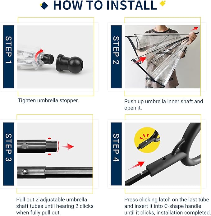 - How to assemble: 1. Tighten the umbrella stopper at the top of the umbrella 2. Push the inner shaft of the umbrella upwards and open it 3. Pull out the inner tube from the shaft until it clicks.