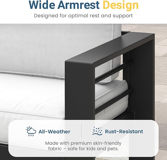 - Enhanced Safety: The metal outdoor chair is designed with multi-beam armrests to prevent children from accidentally getting stuck while playing, ensuring added safety. Constructed with rectangular aluminum tubes and vertical slats, it provides exceptional weight capacity and stability. Available in beige, light gray, and gray, it’s perfect for patios, gardens, decks, and pool areas, elevating your outdoor living experience.