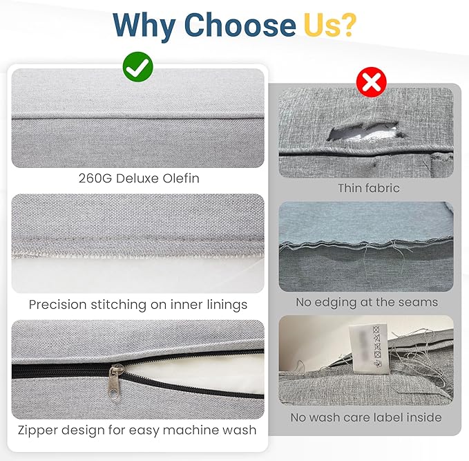 - Upgraded Cushions: This cushion, crafted from 260G deluxe Olefin fabric, blends style and functionality. With a color fastness rating of 5, its vibrant colors stay bright even after prolonged sun exposure. The soft, skin-friendly texture is ideal for homes with kids and pets, ensuring comfort and safety. Additionally, the precise stitching and high-quality inner lining showcase fine craftsmanship, adding elegance to every detail.