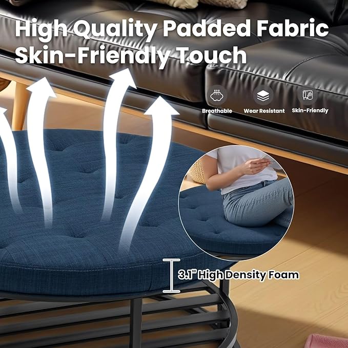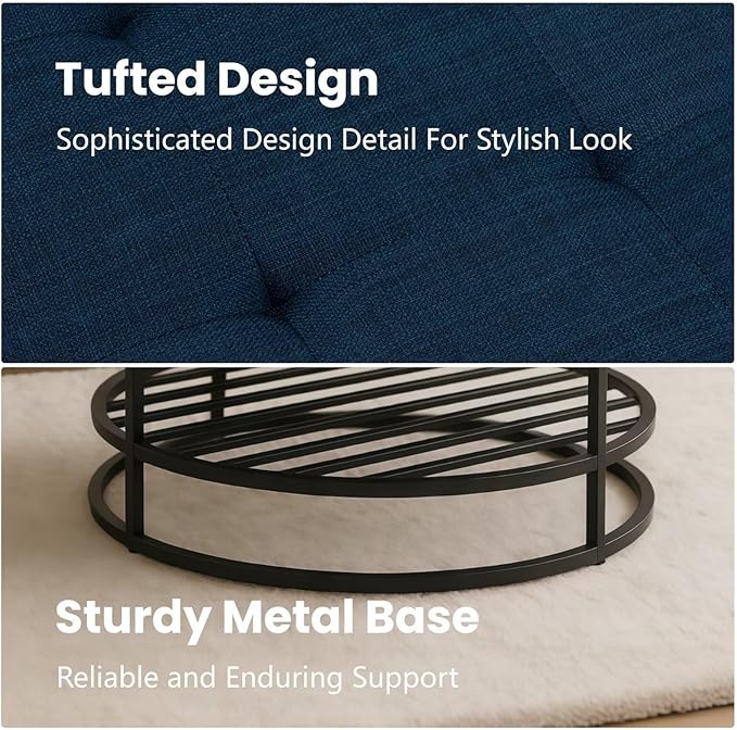 Ottoman Coffee Table with Upholstered Tufted Linen Fabric, Round Center Table with Storage Large Footrest Ottoman for Living Room Navy Blue