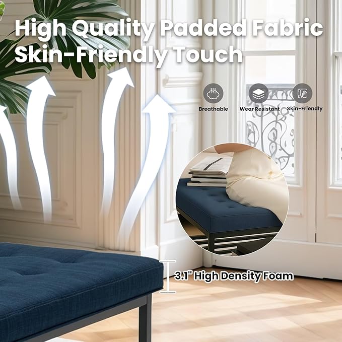 Ottoman Coffee Table with Upholstered Tufted Linen Fabric, Square Center Table with Storage Large Footrest Ottoman for Living Room Navy Blue