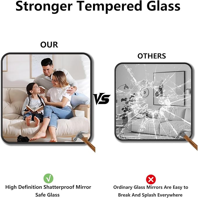 - Safe & Secure Tempered Glass: Built with shatterproof tempered glass and rust-resistant aluminum frame, this wall mirror for bathroom mounts securely above sinks. Steam-proof design withstands daily showers and heavy use—zero cracks, rust, or warping. Sleek, reliable, and perfect for high-traffic bathrooms: clear reflections, durable protection.
