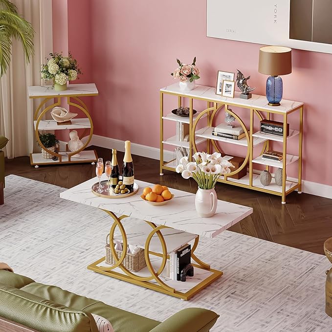GiftGo 47" Industrial Console Tables for Entryway Rustic Sofa Table Behind Couch 4 Tier Wooden Shelves Entry Table with Storage for Foyer, Hallway, Front Door,Living Room (White Gold, 47")