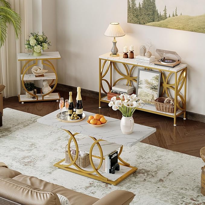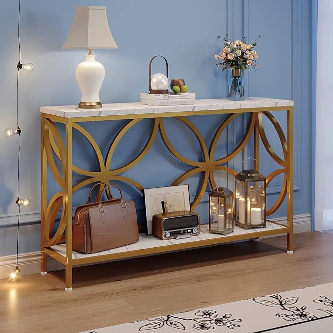 GiftGo Narrow Sofa Table 47.2 Inch, Industrial Sofa Table Behind Couch, Vintage Entry Console Table with Storage for Entryway, Living Room, Foyer, Elegant Design (White and Gold, 47.2)