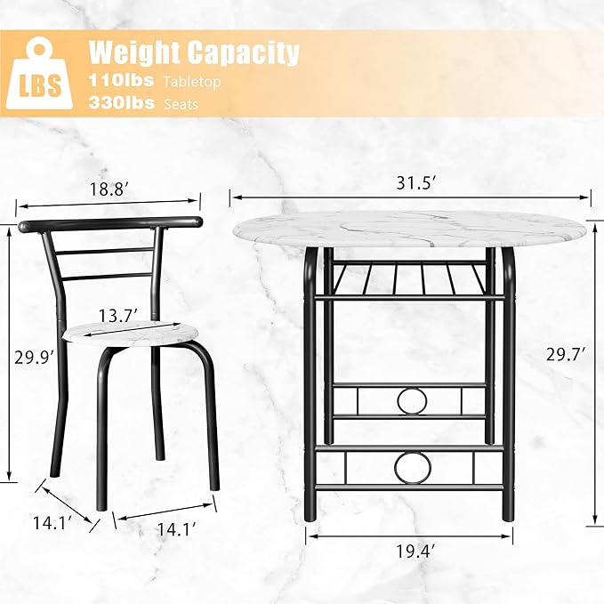 - Space-saving Design - 3 Pieces two Chairs and Table Set is elegent for any compact space, the chairs can be tucked under the table when not in use. The back of the chair fits perfectly with the rounded edge of the table, saving half the space. Oval-like desktop design makes it easy to fit into any small space.